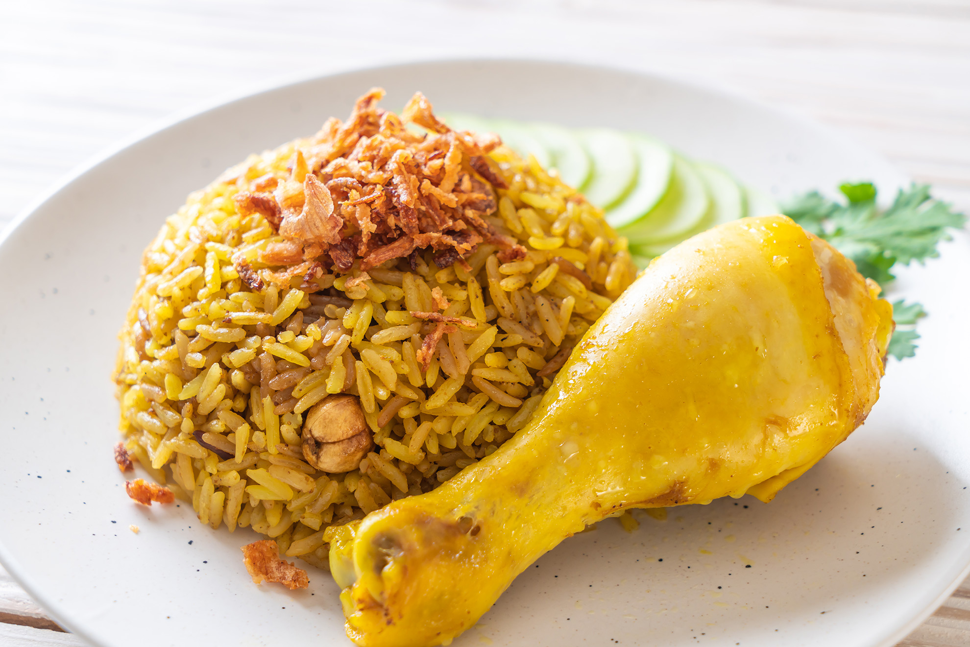 Gelber Reis mit Huhn ist die thailändische Variante des (in Indien bekannten) Chicken Biryani. Für dieses Gericht werden relativ viele Zutaten benötigt und es sind auch mehrere Arbeitsschritte zur Vor- und Zubereitung erforderlich. So müssen Sie u.a. eine Marinade für das Huhn erstellen, für die wiederum verschiedene Samen und Gewürze miteinander vermahlen werden. Des Weiteren müssen Schalotten geröstet und eine Biryani-Sauce (aus frischen Kräutern) zubereitet werden. Sind die vorbereitenden Arbeitsschritte aber erst einmal erledigt, ist der Rest der Zubereitung dann eher einfach.