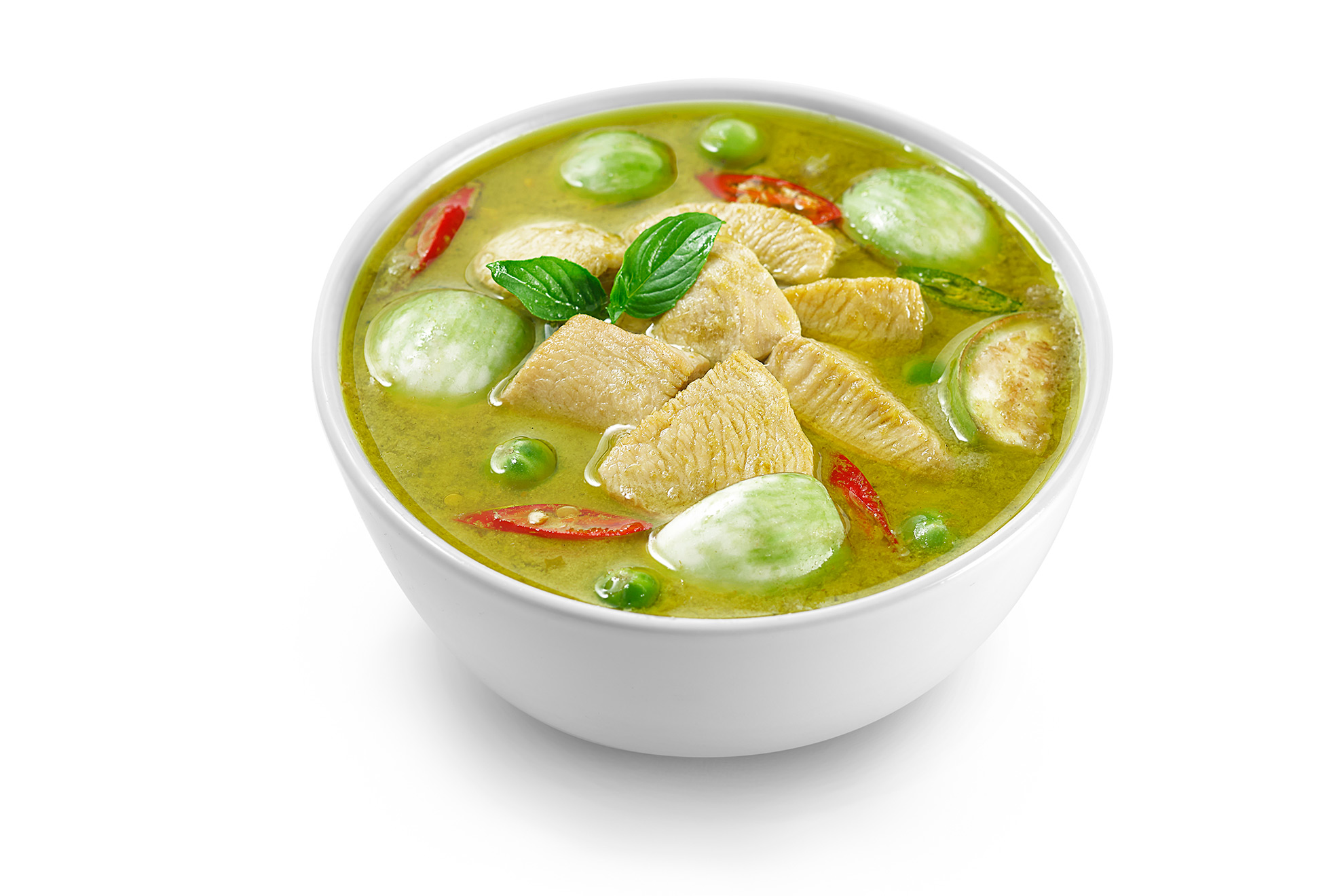 Grünes Thai Curry mit Huhn ist eines der beliebtesten Curry-Gerichte in Thailand. Mit seiner cremig-grünen Farbe ist es optisch bereits äußerst appetitanregend. Durch die Zutaten (wie Zitronengras und Kafir-Lime-Blätter in der Paste) und der gehaltvollen Kokosnussmilch, hat diese Gericht sowohl einen frischen aber auch geschmackvollen Charakter. Von der Schärfe der Paste, ist das grüne Curry, durch die Zugabe frischer grüner Chili-Schoten, eine recht scharfe Variante. Durch die Dosierung der Kokosmilch, kann es aber bei der Zubereitung etwas milder abgeschmeckt werden.