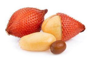 Die Salak nennt sich in Thailand Ragam (ระกำ) und gehört zur Gruppe der Palmenfrüchte. Die Salakpalme hat ihren Ursprung auf den indonesischen Inseln Sumatra und Java, wurde aber auch in Thailand und anderen Ländern kultiviert. Da die Salak kälteempfindlich ist, gedeiht Sie nur in im tropischen Klima, wo sie in Dickichten auf feucht sumpfigen Böden wächst. Die eiförmige Salak-Frucht besitzt eine braunrote bis rostrote Fruchtschale, welche von ihrem Erscheinungsbild an eine Schlangenhaut erinnert. Somit ist sie im Handel auch unter den Namen Schlangenfrucht bzw. Schlangenhautfrucht erhältlich. Das Fruchtfleisch ist gelblich und teilweise in einen leichten Rosaton übergehend. Es besteht aus zwei bis vier Fruchtspalten, welche einen dunklen Samenkern enthalten. Der Geschmack der Salak erinnert ein wenig an dem der Jackfrucht mit Noten von Birne und Litschi. Er ist aber nicht unbedingt jedermanns Lieblingsgeschmack. Somit sollten Sie die Frucht erst einmal probieren, bevor Sie eine größere Menge davon kaufen.
