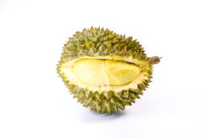 Durian, im thailändischen Thurian (ทุเรียน),  ist vielen auch als sogenannte Stink- oder Stinke-Frucht bekannt. Diesen unrühmlichen Namen verdankt sie ihrem ziemlich penetranten Geruch. Dieser führt unter anderem auch dazu, dass diese Frucht in vielen Hotels verboten ist. Bei der Durian scheiden sich u.a. auch die Geister. Der eine liebt und vergöttert sie und der andere ekelt sich vor dieser Frucht. In Thailand ist sie auf jeden Fall eine der beliebtesten Obstsorten und gilt hier sogar als Königin der Früchte. Der Geschmack wird als nussig mit Noten von Vanille und Zwiebeln bezeichnet. Den Reifeprozess vergleiche ich gerne mit dem von einem Camembert oder Limburger. Jung und unreif ist das Fruchtfleisch noch hart, der Geschmack eher neutral und der Geruch unauffällig. Mit zunehmendem Reifegrad wird die Konsistenz vom Fruchtfleisch dann weicher, und der Geschmack sowie auch der Geruch nehmen deutlich zu.
