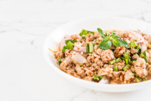 Larb ist eine Salatkreation mit lauwarmem Hackfleisch, die insbesondere dem Nordosten von Thailand und dem angrenzenden Laos entstammt. Das würzige, und süß-scharfe Dressing besteht hierbei aus Limettensaft, Fischsauce, fein gemahlenen getrockneten Chilischoten und Zucker. Dazu kommt noch die wichtigste Komponente, die bei dem Dressing vom Larb absolut nicht fehlen darf. Dies ist trocken gerösteter Klebreis, welcher anschließend fein gemahlen wird und dem Salat seine nussige Note verleiht. Abgerundet wird der fertige Salat dann noch mit Korianderblättern und Frühlingszwiebeln. Das bei diesem Salat verwendete Hackfleisch ist hauptsächlich vom Schwein oder Huhn.