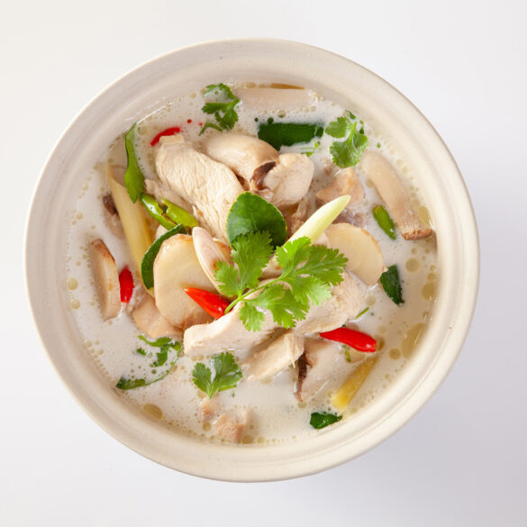 Diese Thai-Kokos-Suppe, oder auch Tom Kha, ist eines der beliebtes thailändischen Gerichte. Die Hauptbestandteile dieser Speise sind Kokosmilch, Galgangal (Thai-Ingwer) und Zitronengras. Als klassische Einlage wird hier in der Regel das Brust- oder Beinfleisch vom Huhn verwendet. Wer es jedoch gerne anders mag, kann hier auch durchaus Schweinefleisch oder Meeresfrüchte verwenden. Die Verwendung von Tofu ist zudem eine hervorragende Alternative für Vegetarier. Auf Grund des milden Geschmacks, ist die Tom Kha Suppe auch eine geeignete Mahlzeit, für all diejenigen, die es nicht so scharf mögen.